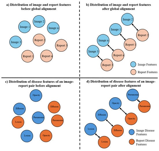 As shown in Figure 5a,b, after global alignment training, the features obtained from the encoder of the image and report will move from a chaotic state to an aligned state, which makes the extracted features of the image richer in valuable information.