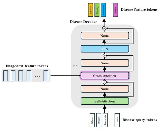 Disease decoder based on Transformer decoder structure. Disease query tokens are taken as input and made to interact with image or text features to extract the relevant disease features in the image/text.