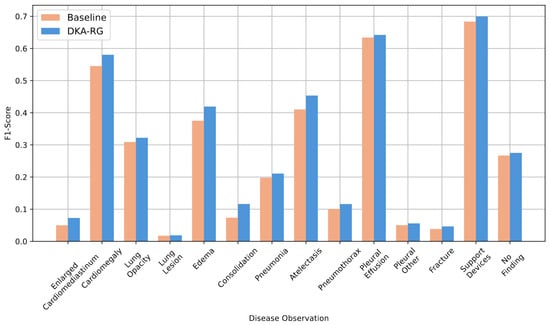 Clinical efficacy F1-score on different diseases for the baseline and our DKA-RG method.