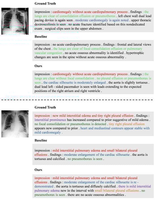 As mentioned above, the core innovation of our work is the alignment of features of medical images and report texts with the help of the medical knowledge graph. Previous work often only performs coarse-grained alignment at the global level or directly trains end-to-end image-to-report text generation, which is suitable for general-purpose domains but not for domains such as medical diagnosis that require more detailed processing of images and text. Our approach takes into account the specificity of medical diagnosis and introduces the medical knowledge graph as an additional knowledge supplement to help the model mine medical features. At the same time, we additionally design image–report disease-level feature alignment for disease disorders that has not been considered in previous approaches, which facilitates the feature extraction capability of medical images and reports at a finer-grained level, thus improving the accuracy of the final medical image-to-report generation.