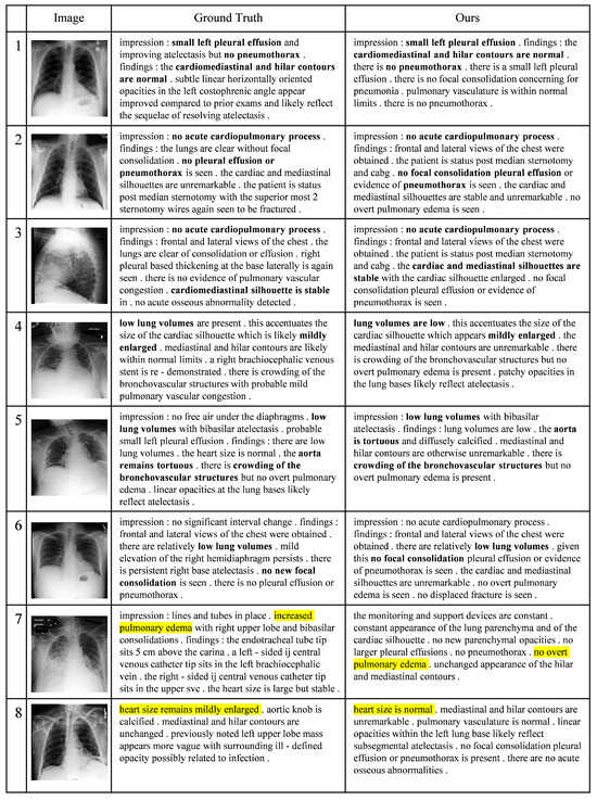 Figure 9 shows more examples of comparing the medical reports generated by our method with ground truth. In most cases, our method can generate report content that is consistent with the ground truth, but there are also a few examples of errors. As shown in the 7th and 8th examples in Figure 9, this also indicates that the current medical report automatic generation system has not yet reached a very perfect level, but it can still be used as an auxiliary tool for human physicians.