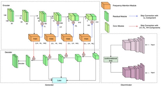Finally, as shown in Figure 1, we use the skip connection with the LL component in the encoding stage to ensure that accurate and realistic image features are captured throughout the feature extraction process. This approach effectively utilizes the global information of the LL component to maintain the details and integrity of feature extraction. Secondly, we introduce the skip connection with LH, HL, and HH components in the decoding stage to ensure that the utilization of high-frequency features is effectively strengthened throughout the feature reconstruction process, restoring more realistic texture details.