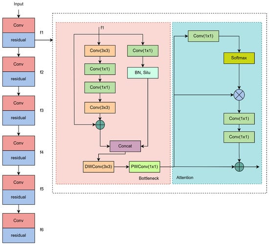 The residual modules consist of a Bottleneck block and an Attention block. The Bottleneck block splits the input feature map channel into left and right parts equally. The right half of the split is convolved by 1 × 1 convolution to transform the channel dimension to half of the output channel, and the feature scale is balanced by a layer and a Silu activation function. The left half extracts fine-grained features through a deep convolutional structure, and then the outputs of the left and right paths are spliced together, and the channel dimension is reduced by deep separable convolution.
