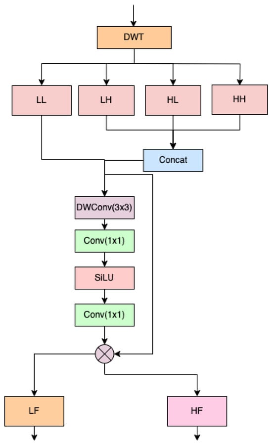 where HF denotes the obtained high-frequency features, LF denotes the obtained low-frequency features, Cat denotes the splicing operation, denotes the 3 × 3 depth convolution, denotes the 1 × 1 convolution operation, and SiLU is the activation function.