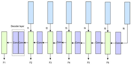 The model structure of the multi-layer decoder (MD) is shown in Figure 4. The multi-layer decoder first takes the semantic feature map f6 of the highest layer in the residual pyramid encoder as the input to the decoder. Next, the feature map f5 in the residual pyramid encoder is combined with the decoded feature map f6 to obtain a new feature map F6. After that, these feature maps are sequentially used as inputs to the decoder and they are decoded to obtain the restored images F5, F4, F3, F2, and F1 at different scales. Finally, the multi-layered residual pyramid generator model is optimized using pyramidal loss, i.e., the output images at different scales are optimized by computing the normalized chemical distance between the output image and the original image at each scale to progressively refine the final output.