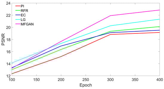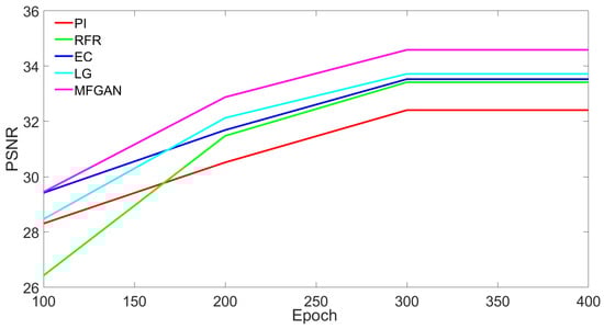 To validate the effectiveness of our method, we conducted a comparison experiment on the ancient painting dataset, using four models for validation comparison PI [36], RFR [37], EC [38], and FcF [39]. The results of the experiment are shown in Table 3. The proposed models are quantitatively evaluated using PSNR, SSIM, MSE, and LPIPS as evaluation metrics. As can be seen from Table 3, the PSNR and SSIM values of the PI model are the lowest, which is because the PI model is insufficient in extracting deep semantic information, resulting in the loss of the high-frequency detail features of the reconstructed images. The insufficient extraction of detail features leads to a poor image restoration effect. The performance of the EC and LG models in China landscape painting image restoration has been improved. The LG model produces better PSNR and SSIM because it uses a large receptive field network to repair the overall structure and local texture details and a small receptive field local refinement network to eliminate artifacts. However, the acceptance area of the local refinement network is small, which means that when the damaged area is large, it cannot capture the global information, resulting in inconsistency between the global and local semantic information. It leads to a more serious plaque effect and a higher LPIPS value. Although the EC and FcF models have improved the performance of ancient painting restoration, it can be seen from the visual comparison of the five methods in Figure 5 that compared with other methods, the proposed method has achieved the best results, and the training has stabilized at the 300–400 epoch stage. In addition, our MFGAN, with a size of 15 M, demonstrates a promising inference time of approximately 65 ms for each image of size 256 × 256. In comparison, the RFR [37] model, which has a size of 33 M, requires an inference time of 95 ms. As a result, our method not only has a lower computational cost but also a faster run time, indicating its potential for practical applications. The PSNR and SSIM indicators reached the highest values of 34.59 and 0.929. This is because MFGAN uses the RPE residual encoder to effectively combine the deep feature extraction module and the channel attention mechanism to fully extract the deep semantic features and detail features of the ancient painting images. Furthermore, MFGAN incorporates the frequency perception mechanism to capture and reconstruct the details and texture features of the ancient paintings by increasing the skip connection between low frequency and high frequency, and effectively restoring the high-frequency details. Finally, this paper uses the double discriminator network to ensure that the semantic information of the restored image is consistent with that of the original painting in terms of global structure and local details, thus ensuring that the semantic information of the global and local areas of the image is consistent during the restoration process.