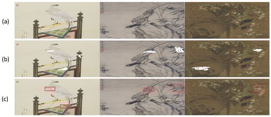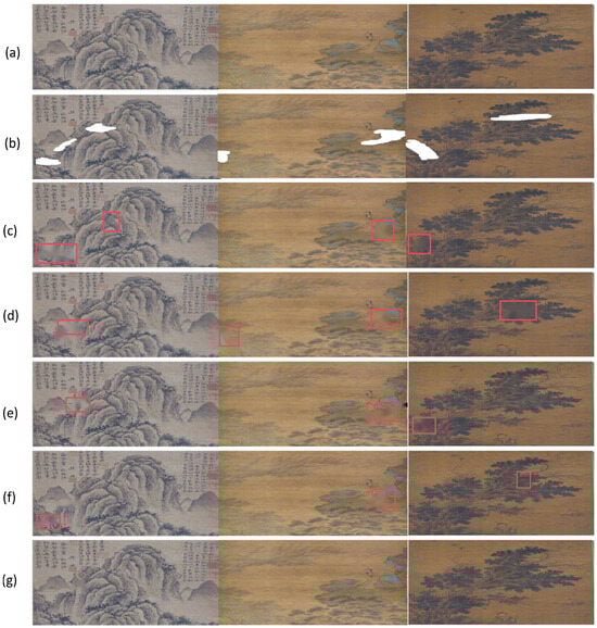 Ancient painting is an important part of traditional art, and its inpainting requires not only exquisite skills but also a deep cultural heritage [2,3]. Traditional inpainting methods [17] mainly include manual inpainting, copying and color replenishment, which rely on the experience and aesthetics of the restorer. The restorer will carefully analyse the damage to the painting. With the advancement of technology, image inpainting methods [18,19,20,21] have introduced digital techniques, such as high-resolution scanning, digital image processing and 3D printing. These technologies can capture and analyze the details of the paintings more precisely, providing a more scientific basis for image inpainting.