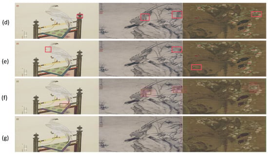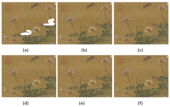 Figure 6 shows the visualization results of different methods on the ancient painting dataset. It can be seen from the figure that Figure 6c,d have loss of detail features in the image inpainting process, Figure 6e,f have noise and distortion in the inpainting process, whereas the proposed method generates a higher-quality restored image in comparison to the other methods, and the image inpainting effect is more prominent in terms of the edge details, which achieves the best inpainting effect.