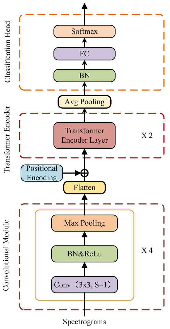 In response to the above, we develop a novel hybrid deep method, CNN-TE, that integrates CNNs with Transformer encoders, effectively combining the benefits of both approaches. The CNN-TE is designed to capture global information from mel spectrograms while keeping the parameter count low and ensuring fast inference. The architecture of CNN-TE is composed of three key components: the convolutional module, the Transformer encoder, and the classification head. Figure 1 illustrates the overall architecture of the proposed CNN-TE model.