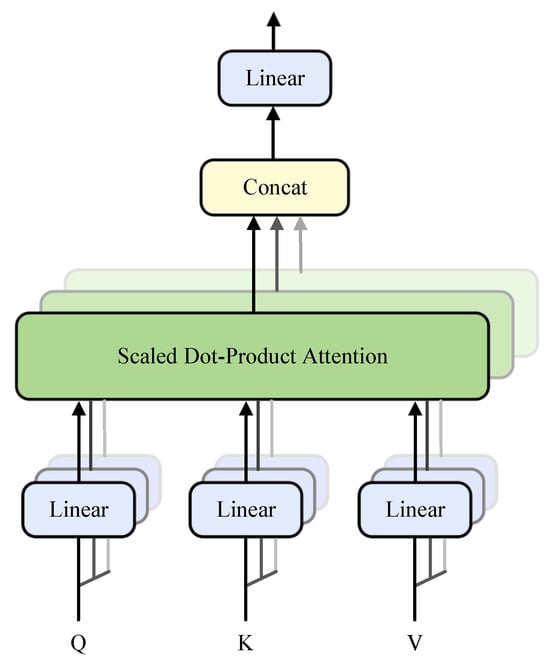 The multi-head attention mechanism allows the model to focus on different parts of the sequence, thus effectively improving feature learning. Figure 3 illustrates the multi-head attention process. In this mechanism, queries, keys, and values are each transformed through h independently learned linear projections. These h sets of projected queries, keys, and values are then processed in parallel using scaled dot-product attention [10]. The resulting h attention outputs are concatenated and passed through another learned linear transformation to produce the final output. The multi-head attention process can be summarized as follows.