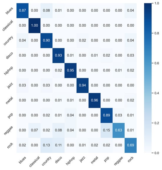 Figure 5 intuitively shows the confusion matrix obtained by the proposed CNN-TE method on the GTZAN dataset. It is obvious that high classification accuracies (≥87%) are obtained for 8 out of 10 classes. There are a few classes that are difficult to distinguish. For example, rock music and country music are easily confused because rock music is developed based on country music, and they have some similarities.