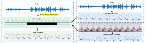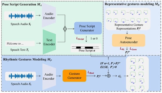 End-to-end generation methods leverage multi-layer networks to encode high-dimensional audio and text features into compact representations, which are then decoded into corresponding gestures, thus avoiding complex rule-based manual annotations [23,24,25]. Gesture expressions exhibit individual styles, and some studies have incorporated role styles in the gesture generation process. GestureDiffuCLIP [26] exploits the powerful capabilities of large-scale contrastive language-image pre-training (CLIP) models to extract efficient style representations from diverse input modalities, including text, example action clips, or videos and transfers them to facilitate novel gesture generation. Yoon et al. [15] represent different roles as identity IDs and jointly input them into the network during training, thereby enabling control over role styles during inference. ZeroEGGS [27] employs a variational framework to learn style embeddings and modifies the final gesture style through latent space operations like mixing and scaling of style embeddings. Alexanderson et al. [28] incorporate style control into the learning process of normalizing flow models. Deep learning models can effectively capture underlying features, as Kucherenko et al. [29] observed a clear consistency between the rhythm of speech and gestures. However, similar speech may correspond to different gestures in the training dataset, and this ambiguity in the data may result in the averaging of the learning results. Additionally, the loss of some high-frequency features during the encoding and decoding processes leads to a lack of richness in the gestures learned by end-to-end methods, limiting the model’s capacity. In addition to end-to-end learning, effectively decomposing gesture synthesis is a research trend.