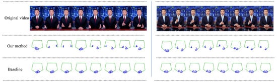 ZHUBO Dataset: We have constructed a dataset of professional Chinese news commentary videos, comprising 613 videos featuring 10 Chinese news anchors. The content of the videos mainly involves speakers providing commentary on current events while employing professional gestures to aid expression. Each video has a duration of approximately 2 min, and operates at 25 frames per second, and in total, our dataset comprises around 20.4 h of footage. To assist with gesture annotation, we extracted the audio of each video in wav format and subsequently used the Mediapipe tool [37] to extract human landmarks. Specifically, we extracted 42 hand keypoints, 33 pose keypoints, and 468 face landmarks, which form the basis of our human landmarks annotation. The dataset was split into training, testing, and validation sets, with 80%, 10%, and 10% of the data being allocated to each set, respectively. Taking the Kang Hui character in the ZHUBO dataset as an example, we utilized 85 videos for the training dataset, with each clip comprising 50 frames at a rate of 25 fps, resulting in 12,296 clips in total, and 10 videos were utilized for the validation set, with a total of 1160 clips included.