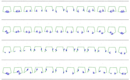 Next, we compute the Euclidean distance between the four landmarks of the current frame and the rest pose (denoted as ). Additionally, we calculate the distance between the current frame and the next frame (denoted as ). By setting a threshold value, we can detect the gesture frame according to (2). When the pose script n is assigned a value of 1, it indicates the presence of a gesture at that particular location. Conversely, a marker value of 0 indicates the absence of a gesture. Consequently, the combination of audio data and the 0–1 annotation forms the dataset used for pose script generation.
