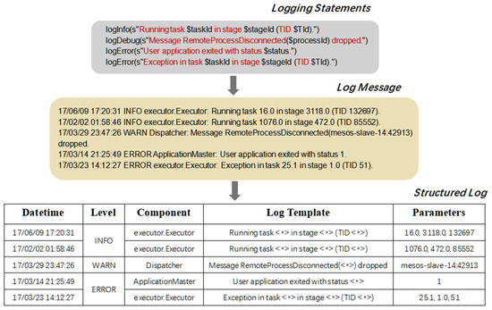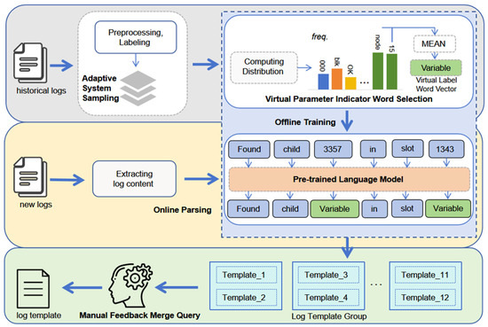 Logs are mainly used to record the state of a system during operation, and engineers can utilize these logs for fault prediction [1,2] or system anomaly detection [3,4,5,6]. In recent years, online services and system software have become an indispensable part of our daily life, and they generate a huge number of software logs every hour, so it is impossible to ensure the quality of service by manually analyzing so many logs. In order to improve the diagnostic efficiency in cases of system anomalies and to reduce the labor cost, the task of automated log parsing has received a lot of attention. The core of this task is to transform the unstructured raw log information into a structured data format, which in turn can be used to feed into various deep learning or machine learning models in order to perform various subsequent missions. Such automated processing significantly speeds up the response time of engineers when dealing with anomalies in engineering projects.