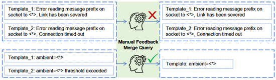 Inspired by Hue [28], we designed and implemented an interactive function for manual feedback to enhance the model’s adaptability to changing and complex log templates. This feature is implemented as follows. After the model automatically extracts log data and forms preliminary log templates to form template groups, the operator has the option to further improve the grouping accuracy by merging the templates. These generated templates are first analyzed, and then similar templates are identified by matching the longest common prefix between different templates. The maintenance personnel can view the similarity information of these templates on the user interface and artificially choose whether to merge these templates according to the actual situation and maintenance requirements.