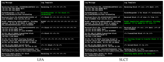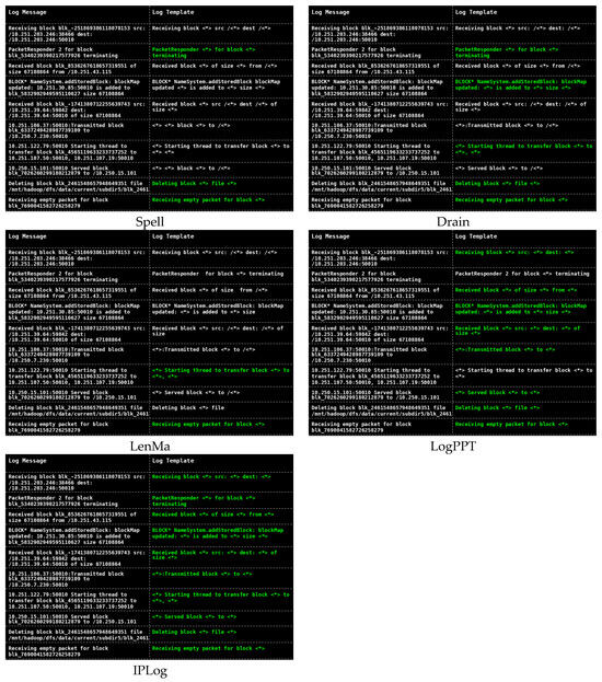 Comparison of parsing results of different parsing methods for ten randomly selected log messages in HDFS (green log templates represent correct parsing).