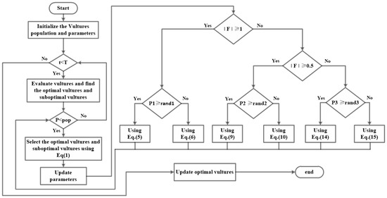 AVOA is a new metaheuristic algorithm proposed by Mirjalili et al. [16] in 2021. This approach mimics the competitive and navigational behavior of African vultures. Known for their unique physical characteristics, African vultures are regarded as intelligent and strong creatures. One of the distinguishing characteristics of African vultures is that they take appropriate actions in different situations depending on the current level of hunger (hunger rate), which is also a characteristic of the AVOA. The solution process of the African vulture optimization algorithm is shown in Figure 1. The mathematical model of the hunger rate is shown in Equation (1).