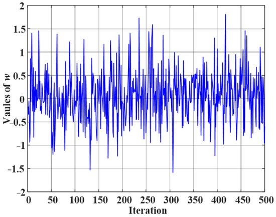 During the process of competition and navigation, the African vulture group mainly uses the position information of the optimal vulture, gradually approaches them, and updates its own position according to Equation (4). During the algorithm-solving process, a new optimal solution is generated around the optimal solution. However, as the iteration proceeds, the population diversity gradually decreases, which may cause the algorithm to fall into a local optimum. In order to overcome this shortcoming, this paper introduces an interference factor w in the exploration stage. The changing trend of this interference factor is shown in Figure 2. In the initial stage of the algorithm, providing a random number can promote a wider search and increase the exploration solution space possibility. In the later stages of the algorithm, the introduction of random numbers helps to escape from the local optimal solution and avoids falling into the dilemma of local search, making it more likely to find the global optimal solution. The definition of perturbation operator is shown in Formula (19).