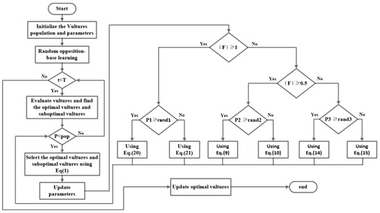 In the African vulture optimization algorithm, the transition between exploration and exploitation depends on the vulture’s hunger rate F. In the early stages of exploration, the algorithm converges slowly due to the lack of diversity in the population. As the number of iterations increases, the value of the hunger rate F gradually decreases, keeping the algorithm in the exploitation stage. However, this algorithm has shortcomings, such as easily falling into local optimality and imbalance in exploration and exploitation capabilities. To solve these problems, this paper first introduces a random opposition-based learning strategy during population initialization to improve the diversity of the initial population. Secondly, interference factors are introduced in the exploration phase of each population, allowing the algorithm to explore more extensively in the search space, effectively improving the ability to avoid falling into local optima, improving the global search capability of the algorithm, and better balancing the algorithm’s explore and exploit. The solution process of the improved African Vulture optimization algorithm is shown in Figure 4.