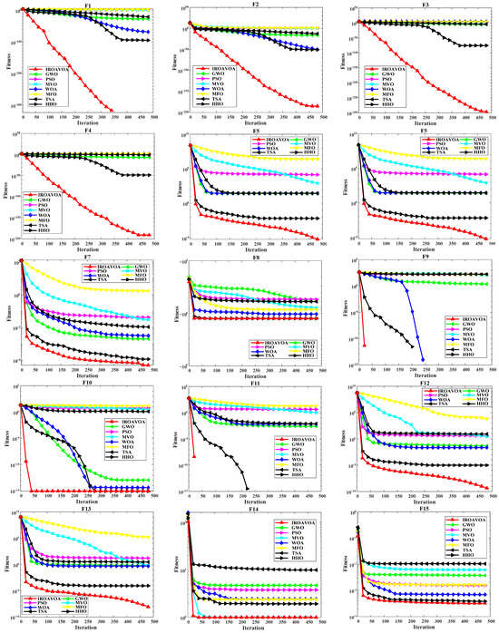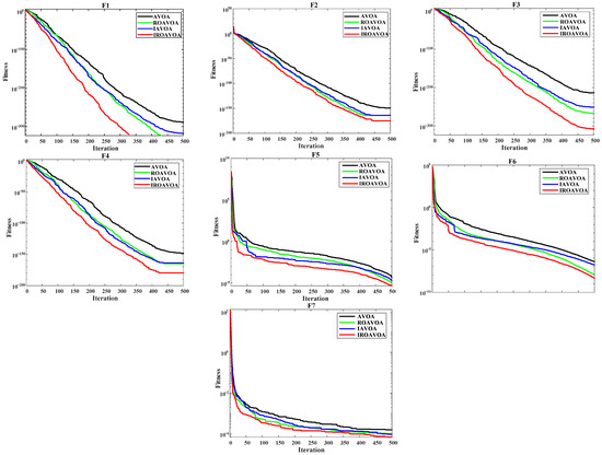 Based on the results, we can find that the performance of the three improved optimization algorithms is superior to traditional AVOA. For the unimodal test functions (F1–F7), IROAVOA outperforms other algorithms on most test functions. For F1 and F3, the four algorithms can achieve the same optimal fitness value, but IROAVOA has slightly better standard deviation than ROAVOA, IAVOA, and AVOA. For F5–F7, all four algorithms did not reach the theoretical optimal value, indicating that IROAVOA has local development potential. For the multimodal testing function (F8–F23), the three improved algorithms showed slight improvements in both the optimal and average values. For F10 and F13–F15, the average value of IROAVOA has reached the theoretical optimal value, and the performance of the other two improved algorithms has also been improved. The three improved algorithms have slightly improved the average values of most test functions, but the search performance has only significantly improved. The main reason is that the traditional AVOA algorithm itself has good search ability and can discover the theoretical optimal solution of multimodal test functions, so the room for improvement is relatively small. These results indicate that the performance of AVOA has been improved to a certain extent by applying random opposition-based learning and perturbation factor.