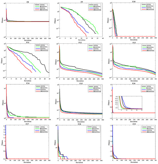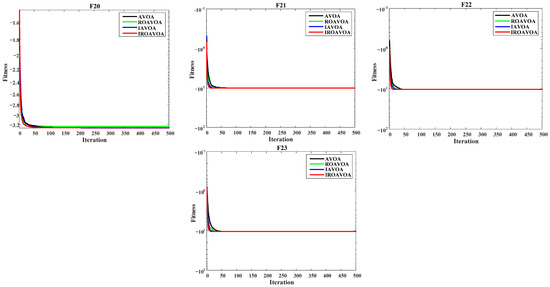 To evaluate the effectiveness of each component, the improved IROAVOA was compared with AVOA, ROAVOA improved based on random opposition learning strategy, and IAOVA improved based on perturbation factor. Under the same experimental design, 23 different types of test functions in Table 1, Table 2 and Table 3 were tested simultaneously, and the optimal values, mean values, and standard deviations were obtained as shown in Table A1, Table A2 and Table A3. To demonstrate the dynamic convergence performance of IROAVOA, the average optimal fitness convergence curves of each test function are shown in Figure 5 and Figure 6.