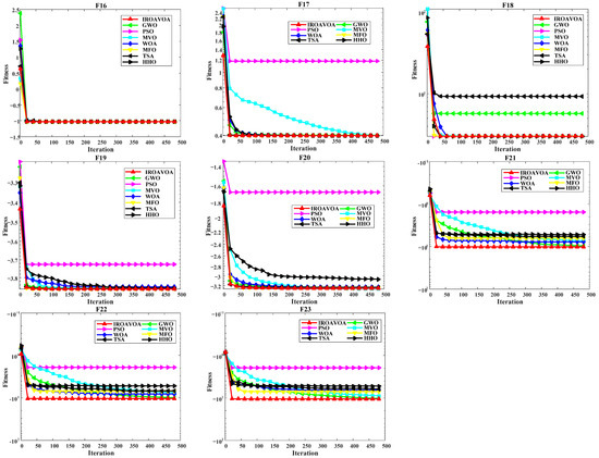 Convergence curves of 23 sets of benchmark test functions between the IROAVOA and other comparative optimization algorithms.