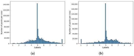 Number of points for each class in the CASE dataset. The label range from 1 to 9 was split into data bins of 0.1. (a) Arousal. (b) Valence.