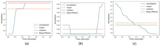 When there is a clear majority in favor of a particular label, the median value aligns with the label of the longest horizontal line. In such cases, the Boyer–Moore and median methods yield the same result, while the mean may produce a different value (see Figure 3a). On the other hand, when there is no clear majority, the Boyer–Moore method does not yield a result and the mean sometimes deviates significantly from the most-selected labels, whereas the median tends to be closer to the labels corresponding to the longest horizontal subsegments, better representing the selected majority of labels for the given segment (see Figure 3b). However, we would eventually discard all window instances that do not meet the criterion when training an emotion recognition model for a particular subject in a real-life scenario. In extreme cases where no label has more more than one vote, the median and the mean yield approximately the same results (see Figure 3c). In this circumstance, neither the median method nor the Boyer–Moore algorithm would produce a representative result and would require discarding an instance, which is not desirable.