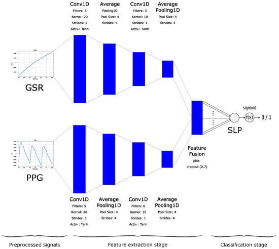 For comparison purposes, we also trained a Convolutional Neural Network with a Single-Layer Perceptron Classifier (CNN-SLP) algorithm, as detailed in [22]. The CNN-SLP is a variation of the model proposed by [17]. It automatically extracts features directly from the GSR and PPG time series, following a representation learning paradigm [30]. These learned features from PPG and GSR are fused into a unified vector, which serves as the input for a Single-Layer Perceptron classifier (see Figure 4).