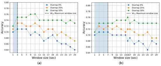 Mean Accuracy performance for different window duration sizes and percentages of overlap, employing Random Forest (RF). The vertical dotted black lines represent the maximum possible window size associated with a representative median (see Figure 6). (a) Arousal. (b) Valence.