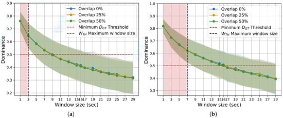 Mean Dominance ground truth label for different window duration sizes and percentages of overlap. Standard deviations are shown as error bands around the average Dominance, following the color convention of the overlap legend. The vertical dotted black lines represent the maximum possible window size that meets the criterion. (a) Arousal. (b) Valence.
