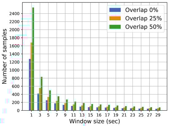 As can be seen in Figure 5, accuracy decreases with increasing window size, both in valence and arousal, when there is no overlap. A similar trend is observed in the accuracy when the . However, when the overlap is , accuracy decreases more slowly. It can be shown that accuracy decreases for window duration sizes greater than 30 s. As expected, the number of window instances also decreases with increasing , as can be seen in Figure 7. For , the optimum window duration size is 3 s for both arousal and valence in terms of ACC, UAR, and F1 scores. Moreover, from our results, all metric scores increase as the overlap increases.