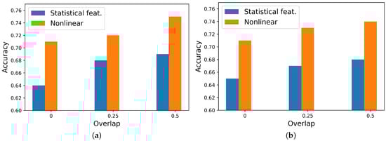 Both temporal–statistical and nonlinear features were extracted for different window duration sizes and percentages of overlap. In every case, nonlinear features outperformed temporal–statistical features in terms of performance. Figure 8 illustrates this comparison. In the best case, nonlinear features yielded an accuracy of 0.75, while temporal–statistical features achieved 0.69.