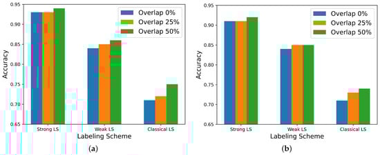 These effects could be due to the reinforcement in the model’s training caused by the overlap, which allows capturing emotional information that would otherwise be missed in the no-overlap situation with the same window duration. The mentioned classification algorithms require a single label value per window (i.e., per instance), which has a ‘filtering’ effect on local label fluctuations in specific parts of the window when the annotations are continuous. However, these local fluctuations can be captured by an adjacent overlapping window, provided that a proper window size and overlap stride are chosen. In this way, the overlap ‘reinforces’ the learning. Without overlap, these local label variations might be ‘missed’ or filtered out, resulting in the loss of emotional information. In Figure 10a, we show two adjacent windows without overlap. Label fluctuations in the last 5 s of the first window are not captured by the median label. However, these fluctuations can be captured by the median of the adjacent window if the overlap is increased, as illustrated in Figure 10b. Interestingly, accuracy does not fall abruptly as window durations increase (see Figure 5). This could be attributed both to the greater volume of data (i.e., a greater number of available data segments comes with increased overlap ratios) and to the reinforcement in learning provided by the overlap.