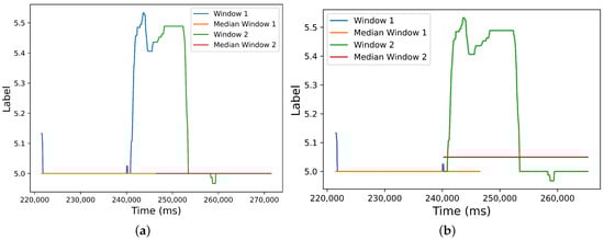 We think this method better represents user labeling than replacing the annotation segment with its mean value. If , this method yields the same results as the Boyer–Moore voting algorithm [25] but without discarding any window instances a priori. The Boyer–Moore voting algorithm is a standard majority method that only yields a result if the majority value has more than half of the total samples in the window.