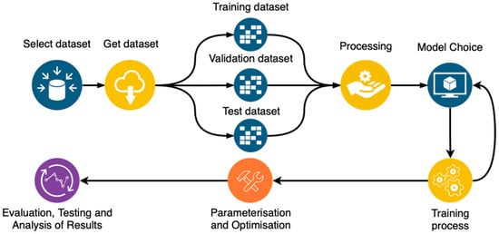 For each segmentation task, a dataset was carefully selected to match the specific requirements of the experiment. An automated processing pipeline was then developed using Python scripts to standardize the sequence of pre-processing, model training, and evaluation. This pipeline included steps, such as data loading, augmentation, and model fitting, all of which were managed through a modular approach that allowed for easy modification and testing of different architectures and parameters. Figure 2 illustrates the detailed workflow, highlighting each step from data pre-processing to final model evaluation. In the initial phase, the data underwent pre-processing techniques, including image resizing, normalization, and random image inversions and rotations. Subsequently, the dataset was subdivided into three components and subjected to the defined processing techniques. Following this, for each of the models implemented across the tasks, the training, parameterization, and optimization processes were meticulously initiated. Finally, the trained models underwent rigorous testing, evaluation, and analysis to ascertain their efficacy and performance.