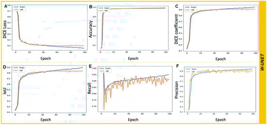 Graphs of the metrics obtained during the learning phase in image detection and segmentation for W-UNET architectures. (A) Graph of loss values vs. number of iterations (Epochs); (B) Graph of accuracy values vs. number of iterations (Epochs); (C) Graph of DICE coefficient values vs. number of iterations (Epochs); (D) Graph of IoU values vs. number of iterations (Epochs); (E) Graph of recall values vs. number of iterations (Epochs); (F) Graph of precision values vs. number of iterations (Epochs) obtained with the W-UNET and UNET++ architectures, respectively.