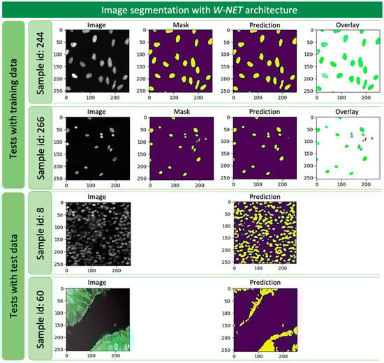 After completing the training process, the model was tested with the images intended for the training and validation process, and more importantly, with the unknown images, that is, those intended only for the test. The choice of images to be segmented was random. Some of these results, by way of demonstration, are shown in Figure 4, where the results obtained with training images and images only to be used in the test phase with W-UNET architecture can be analyzed.