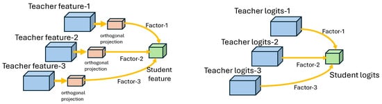 The use of multiple orthogonal projections in our approach offers several key benefits for multi-teacher knowledge distillation. Firstly, it allows for the preservation of important geometric relationships in the feature space during the knowledge transfer process, ensuring that critical structural information from each teacher is retained. This is particularly valuable when dealing with diverse teacher models that may capture different aspects of the problem domain. Secondly, the orthogonal nature of the projections minimizes interference between different teachers’ knowledge, allowing the student to effectively learn from multiple sources without conflicting information. This can lead to more robust and comprehensive knowledge transfer, especially in scenarios where teachers have complementary strengths. Additionally, the flexibility of our approach in adapting to different teacher–student combinations through the optimization of projection matrices enables more efficient and targeted knowledge distillation. This adaptability is crucial for handling heterogeneous teacher ensembles and varying student architectures, potentially leading to improved generalization and performance across a wide range of tasks. Furthermore, by aligning teacher representations in the student’s feature space, our method facilitates more direct and interpretable knowledge transfer, which can be particularly beneficial for analyzing and understanding the distillation process. Overall, these benefits contribute to a more effective and versatile multi-teacher knowledge distillation framework, capable of leveraging diverse teacher ensembles to train highly efficient and performant student models.