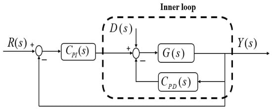 Every action taken by the PID regulator in a traditional closed-loop system occurs via the forward path. This can cause an unwanted occurrence known as a derivative kick. To solve this issue, the PD part of PI-PD regulators is moved to an internal feedback loop, which moves the poles of the plant transfer function to a more favorable location where the PI component operating in the onward path might more adequately control it [4,18]. The PI-PD regulator’s architecture is shown in Figure 1. The inner loop is composed of the transfer functions of the plant, , and the PD controller, , whereas the external loop is composed of the transfer functions of the inner loop and the PI regulator, . The transfer functions and of the PI-PD regulator are written as follows: