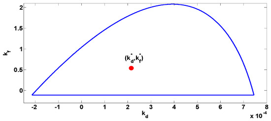 Stability region of the PD controller for Case study 1 for the nominal parameters.