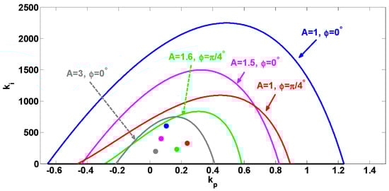 The line and Equations (17) and (18) are used to determine the stability region of the outer loop. To plot Equations (17) and (18), is changed throughout the range of , where is found by equating Equation (18) to zero and taking the first solution. After applying the formulae from Equations (10) and (11) to Equations (17) and (18), correspondingly, the settings of the PI controller are determined as follows: