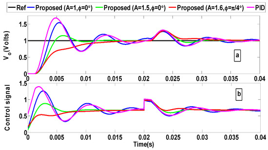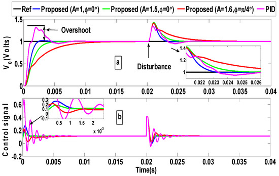 (a) Closed-loop responses for DC–DC buck converter under a 0.3 disturbance amplitude and for the nominal parameters; (b) corresponding control signals.