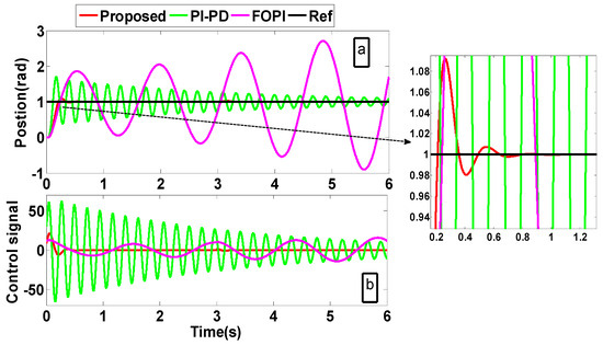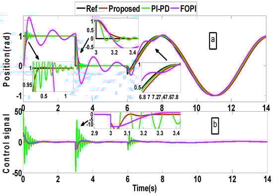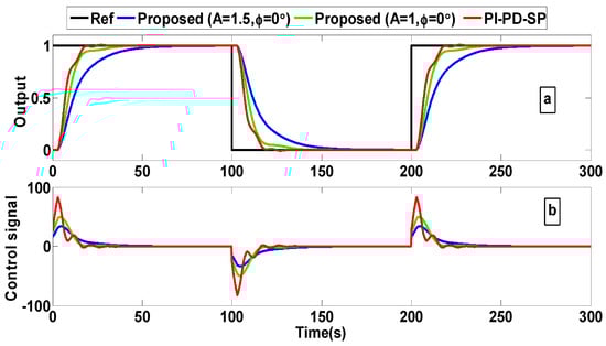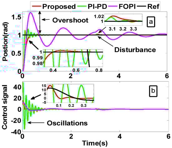 First of all, the investigated methods are tested using the nominal parameters and by applying a unity response and unity disturbance at t = 0 s and t = 3 s, respectively. Figure 9 displays the outcomes for this test. It is clear from the figure that FOPI [26] has poor performance with oscillatory response and long settling times. On the other hand, the proposed method offers a quick response with zero overshoot and a similar disturbance rejection capability relative to PI-PD [4], which has an oscillatory transient response. Also, the PI-PD [4] consumes more energy relative to the proposed controller as seen in the control signals given in Figure 9b.