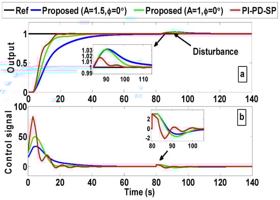 (a) Closed-loop responses for the temperature control under a unity disturbance amplitude and 70% time delay model uncertainty; (b) corresponding control signals.
