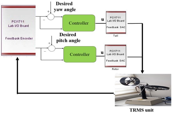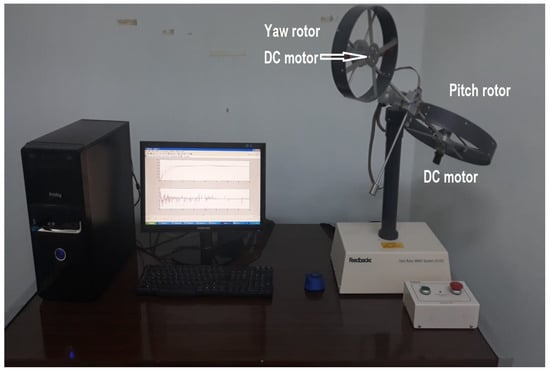Experimental results: Here, the proposed technique is tested using a real-time trial on a TRMS. The dynamics of the nonlinear TRMS system are comparable to those of a helicopter. As seen in Figure 16, it comprises two DC motors that drive the pitch and yaw propellers at the ends of a beam. The yaw rotor produces horizontal revolution on the yaw axis, whilst the pitch rotor is in charge of the upward motion on the pitch axis. There is a noticeable cross-coupling between the rotor’s actions, with each rotor affecting both angles. The yaw transfer function of yaw angle is identified as [4]. On the other hand, the transfer function of the pitch angle is identified using the input and output data as .