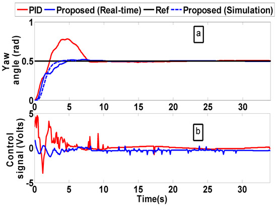 The real-time outcomes for concurrently controlling the pitch and yaw angles are shown in Figure 18 and Figure 19. The simulation outcomes for the suggested method are also displayed in Figure 18a and Figure 19a. Interestingly, the proposed method yields somewhat similar real-time and simulation results, even though the TRMS is a highly nonlinear system with coupling effects that may be challenging to model using low-order transfer functions. The suggested approach exhibits rapid responses with shorter settling times and overshoot, particularly for the yaw response, as seen in Figure 18. Additionally, Figure 18b and Figure 19b demonstrate how much less energy the suggested controller uses than the PID controller [27]. Furthermore, even though the suggested approach is primarily suggested for single-input single-output systems, the suggested controller could continue to function well considering the existence of coupling influences between yaw and pitch angles. This is explained by the flexibility of the suggested approach, which enables the designer to use predetermined gain and phase margin boundaries to achieve the desired performance.