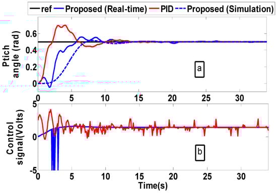 (a) Real-time closed-loop pitch responses for TRMS and (b) corresponding control signals.