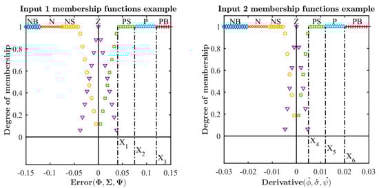 Input membership functions with their six tuning parameters per axis, x1,…,x6. The domain values where they are null have not been represented for clarity.